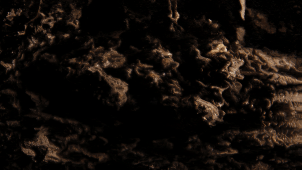 Dark matter is crawling from side to side. Materials morph into fluidity. A sound of seeping and dripping is heard, a grainy texture arises out of the dark. Hushed words creep into the tranquillity. A collage of structures and materialities slowly pieces together, opens its pores, and flows into the ground.